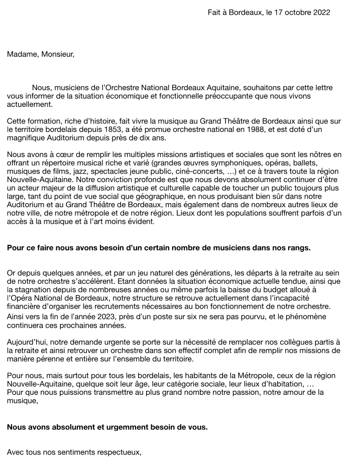 Nous, musiciens de l’Orchestre National Bordeaux Aquitaine, souhaitons par cette lettre vous informer de la situation économique et fonctionnelle préoccupante que nous vivons actuellement.